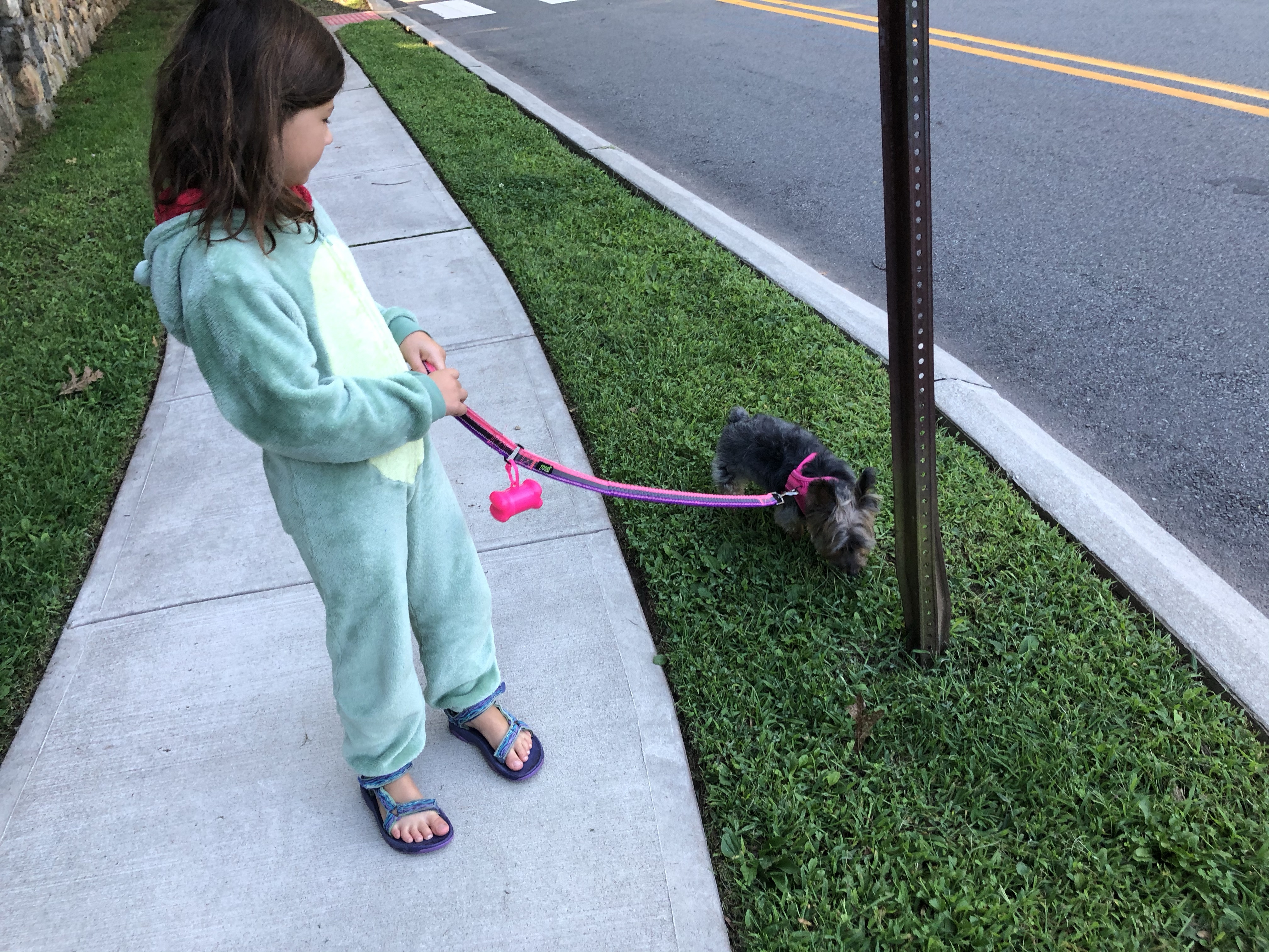 A dragon taking a dog for a walk